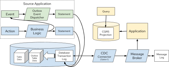 目的 | 在包含领域事件的日志中捕获状态。 | 从事务日志导出变更事件。 | 通过 CDC 从 Outbox 导出领域事件。 | 使用领域事件生成数据 projection。 |