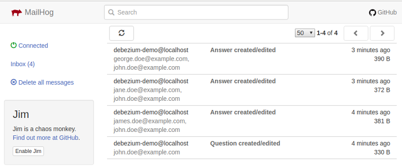 $ curl -v -X POST -H 'Content-Type: application/json' http://0.0.0.0:8080/question/1/answer -d @src/test/resources/messages/create-answer3.json Twitter 帐户应包含一条新推文,文本类似“问题‘狗有几条腿?’有很多答案(生成于 2020-02-17T08:02:33.744Z)”。此外,MailHog 服务器 UI 应显示类似以下的消息。