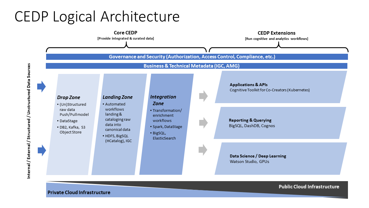 数据被摄取到一个不可变的数据湖的登陆区(Landing Zone)。这个登陆区实现为一个HDFS实例。流式数据(例如新闻)使用Kafka从源端移动,然后使用适当的连接器写入HDFS。