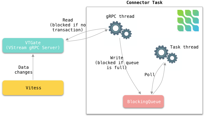 在内部,每个连接器任务使用一个 gRPC 线程来不断从 VStream 接收更改事件,并将事件放入内部阻塞队列。连接器任务线程从队列中轮询事件并将其发送到 Kafka,如图 5 所示。