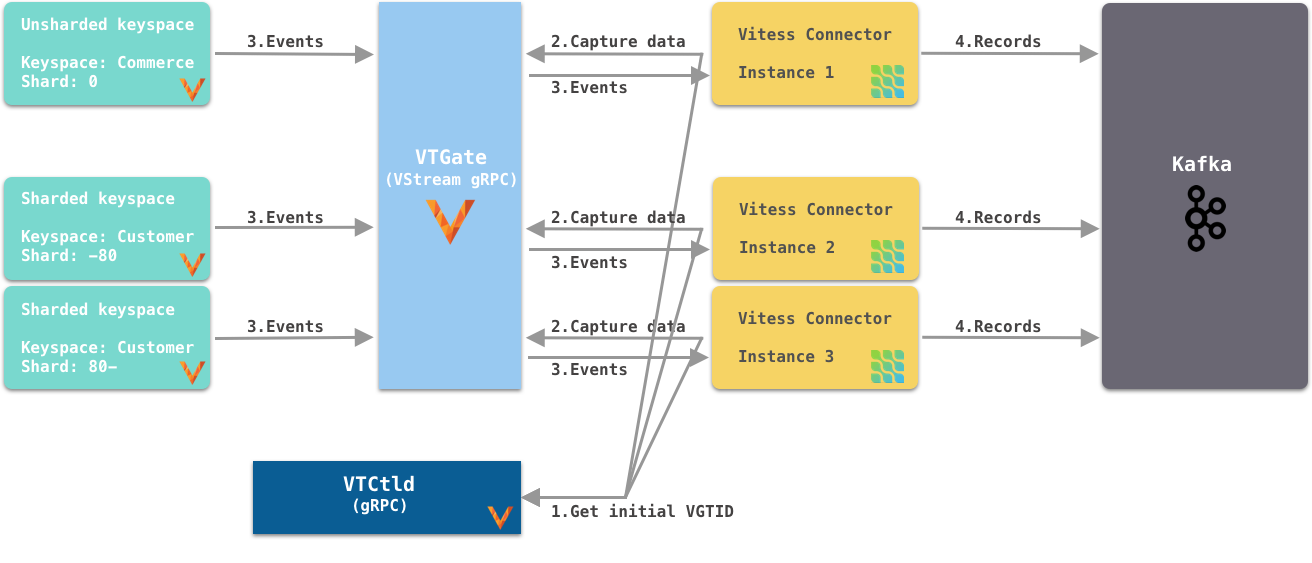 如图 4 所示,每个连接器实例捕获特定键空间/分片对的更改事件。连接器实例通过 VTCtld gRPC(这是另一个 Vitess 组件)获取键空间/分片对的初始(当前)VGTID 位置。每个连接器实例独立使用其获取的 VGTID 来订阅 VStream gRPC,并连续从 VStream 捕获更改事件并将其发送到 Kafka。要支持 Vitess 重新分片操作,您需要更多的手动操作。