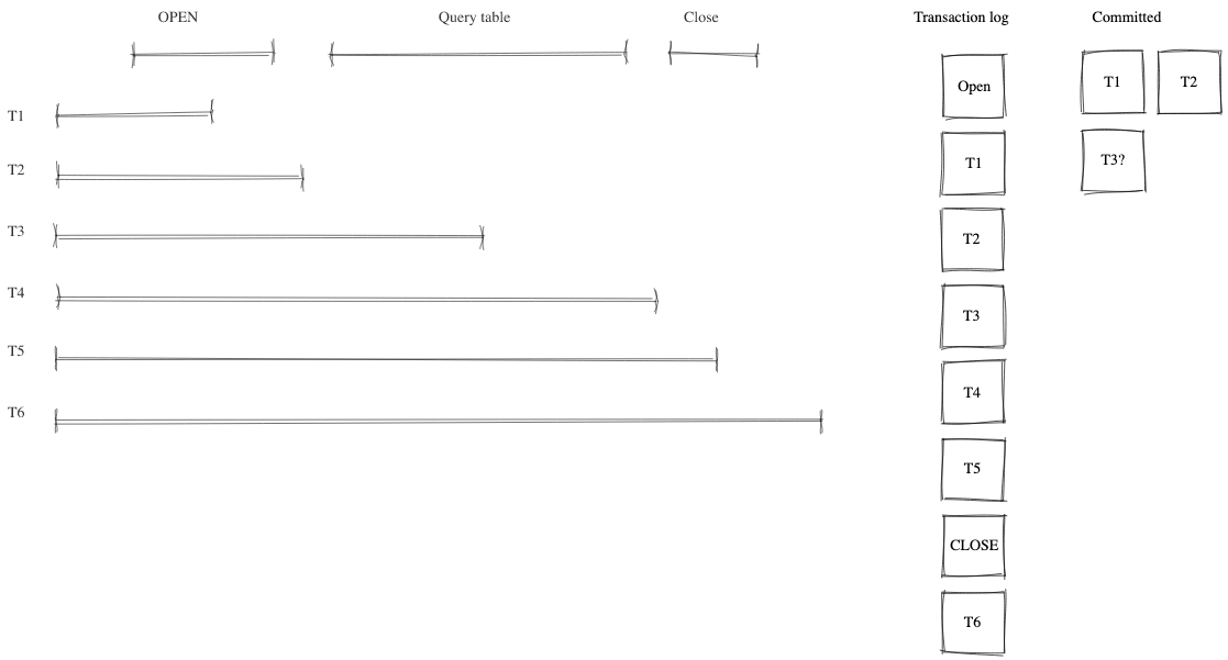 Debezium 并不是唯一访问数据库的进程。我们可以预期有多个进程并发访问数据库,可能会访问当前正在被快照的相同记录。如图所示,对数据的任何更改都根据提交顺序写入事务日志。由于无法精确确定块读取事务的时间以识别潜在冲突,因此会添加打开和关闭窗口事件来区分可能发生冲突的时间。Debezium 的任务是去重这些冲突。