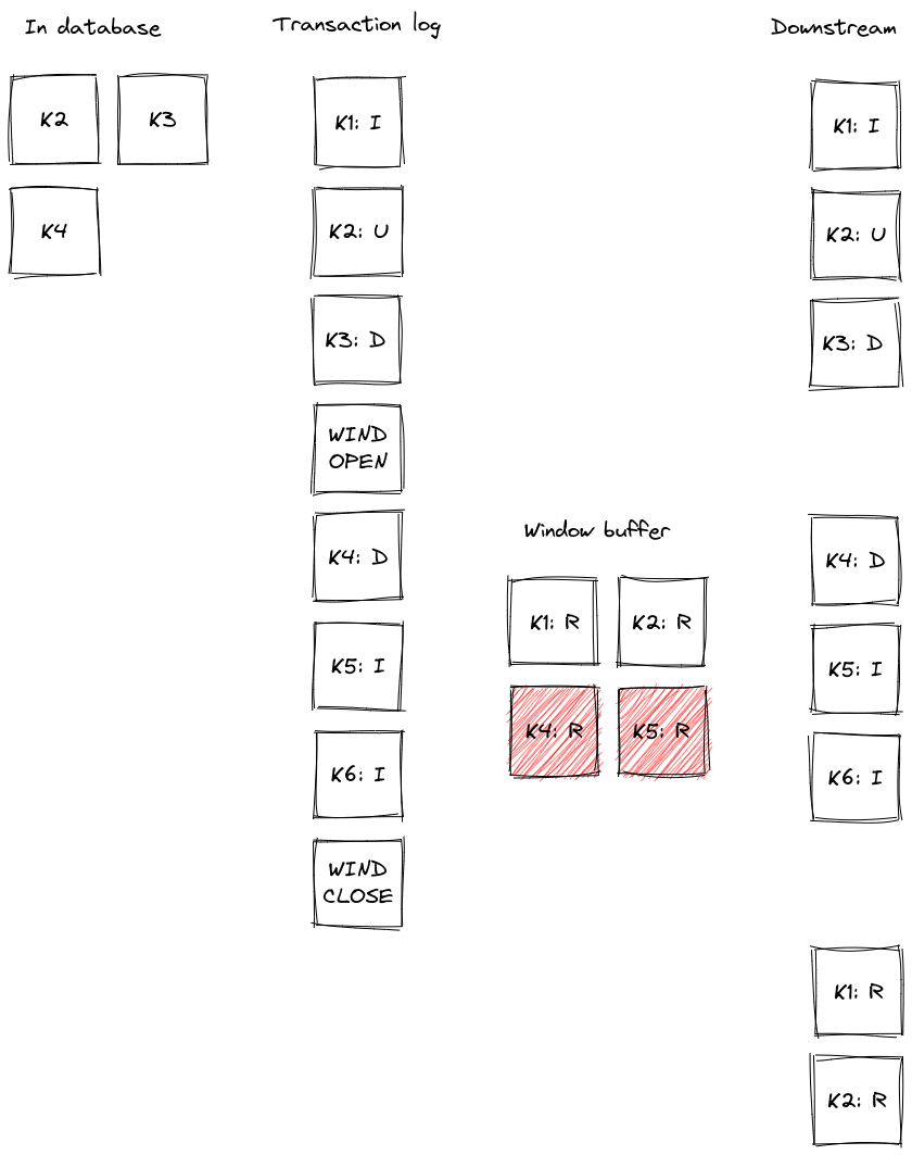 记录 K2、K3 和 K4 已存在于数据库中。在快照窗口打开之前,记录 K1 被插入,K2 被更新,K3 被删除。这些事件在读取日志时被发送到下游。快照窗口打开,其查询将 K1、K2 和 K4 读取到缓冲区中。在窗口打开期间,K4 的删除操作会从事务日志中检索;缓冲区中 K4 的快照事件被删除,删除事件被发送到下游。K5 和 K6 被插入,这将从日志中检索,并发出相应的事件。根据具体的时间,缓冲区中可能还有它们的读取事件(在图中 K5 就是这种情况),这些事件将被丢弃。当快照窗口关闭时,缓冲区中剩余的 K1 和 K2 的快照事件将被发出。
