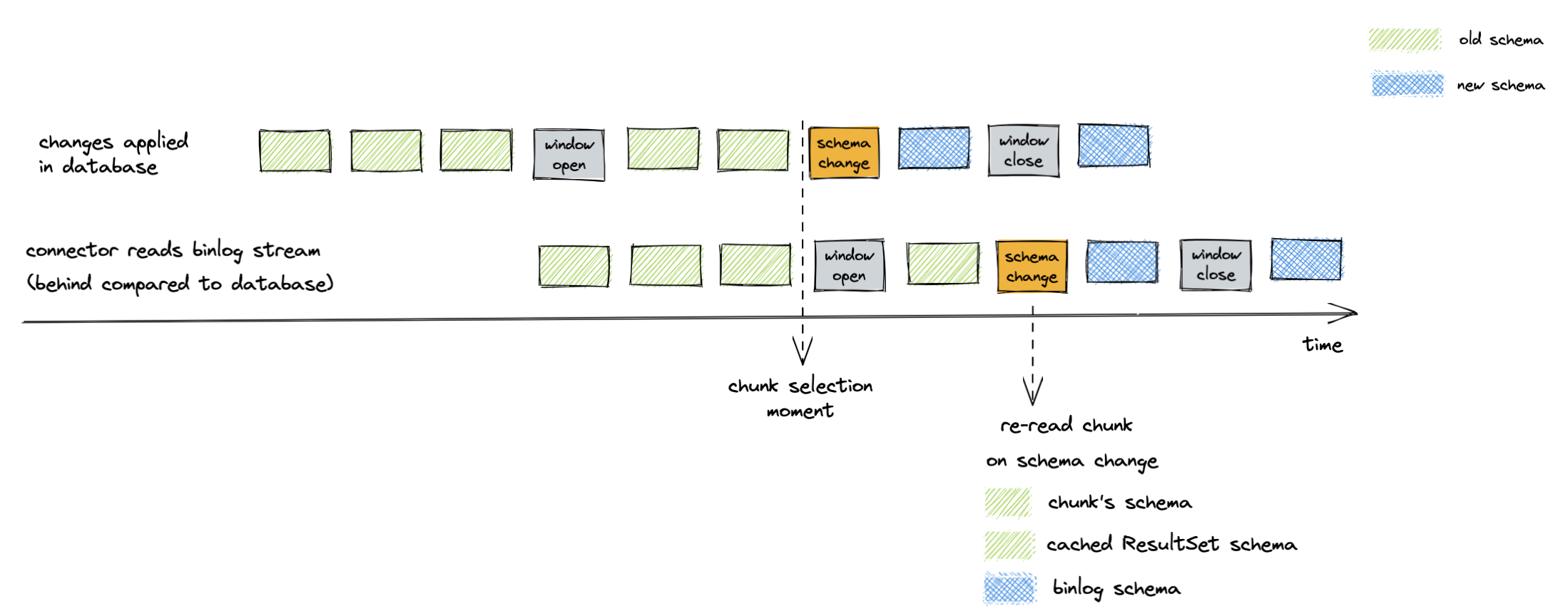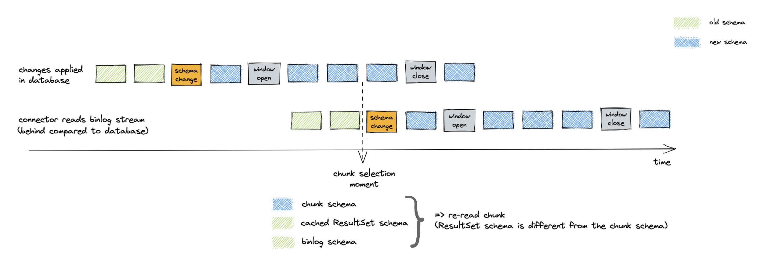 DDL 事件还会触发受影响表的分块重新读取。重新读取可以防止出现窗口关闭时分块模式比 binlog 流旧的场景。例如,下图说明了在模式更改之前选择的分块: