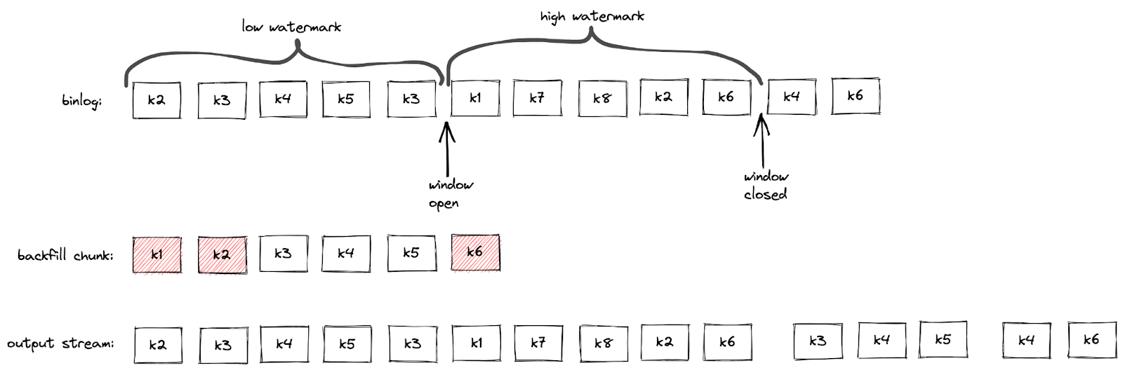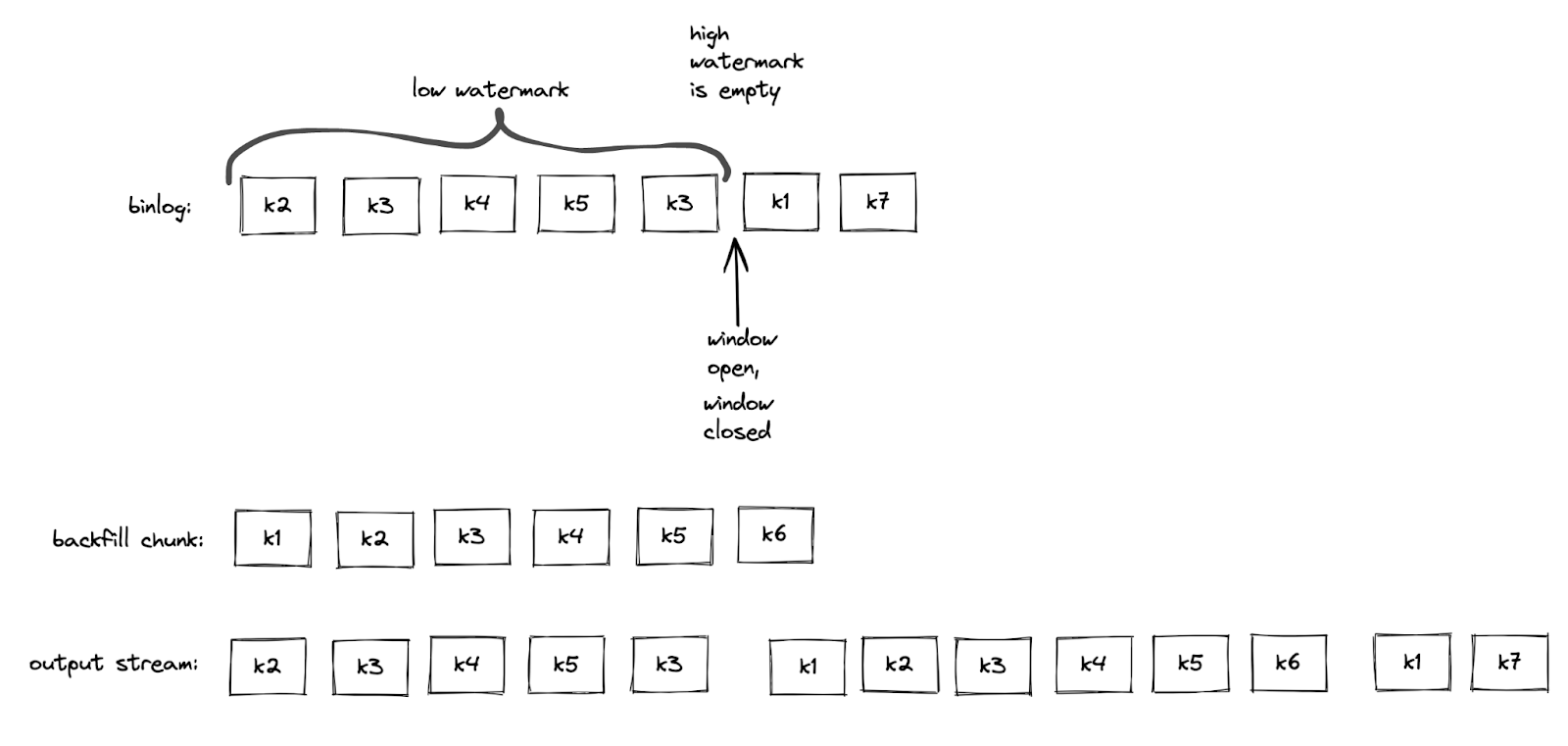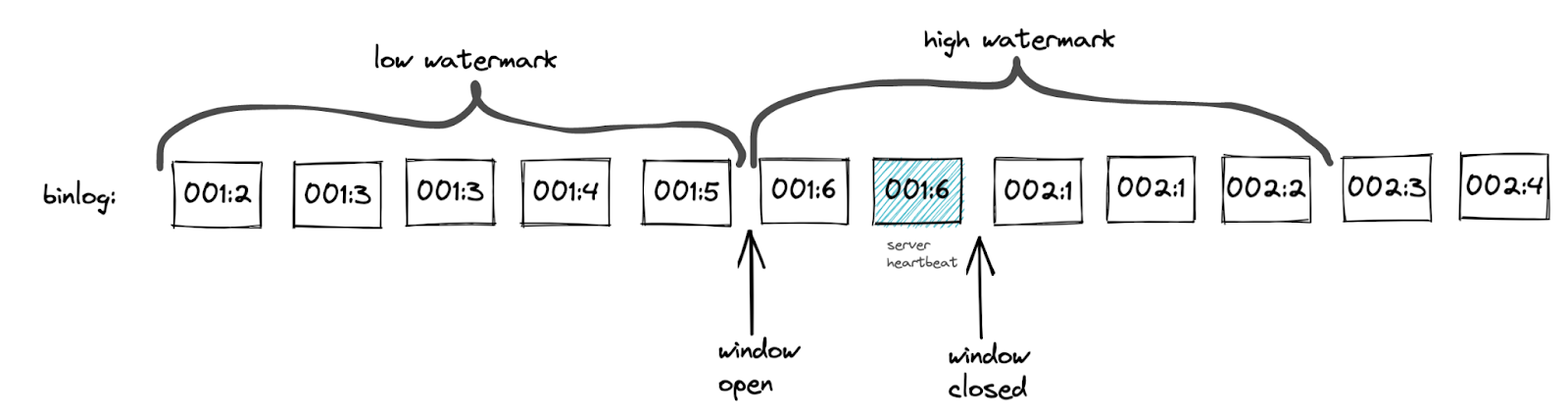 这些水印不会出现在 binlog 流中。相反,算法会将每个事件的 GTID 与内存中的水印进行比较。该实现确保没有陈旧读取,并且一个分块仅包含不早于低水位标记的事件的更改。