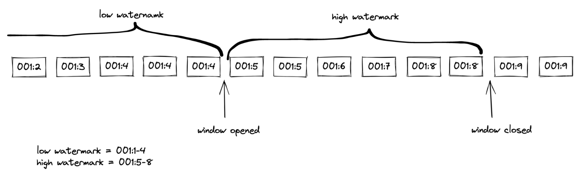 该算法使用心跳事件 GTID 的 server_uuid 部分来获取高水位标记的最大事务 ID。该实现确保高水位标记包含单个 server_uuid。不变的 server_uuid 可以避免心跳过早关闭窗口的情况。请参见下图示例。
